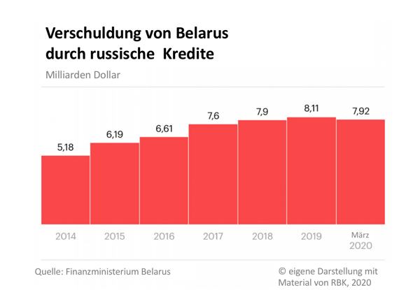 Russland ist für die belarussische Regierung die Hauptquelle für Auslandskredite: Nach Angaben des belarussischen Finanzministeriums machen russische Kredite rund 48 Prozent der Auslandsverschuldung des Landes aus (Stand: Ende des ersten Quartals 2020), das sind 7,92 Milliarden Dollar. An zweiter Stelle steht China, das dem belarussischen Staat bisher 3,3 Milliarden Dollar geliehen hat.